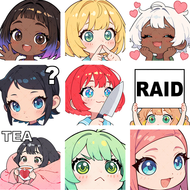Emotes: Delivered as 240px PNG files with transparent backgrounds, and additional sizes (112px, 56px, and 28px) so they can be easily used across different platforms.